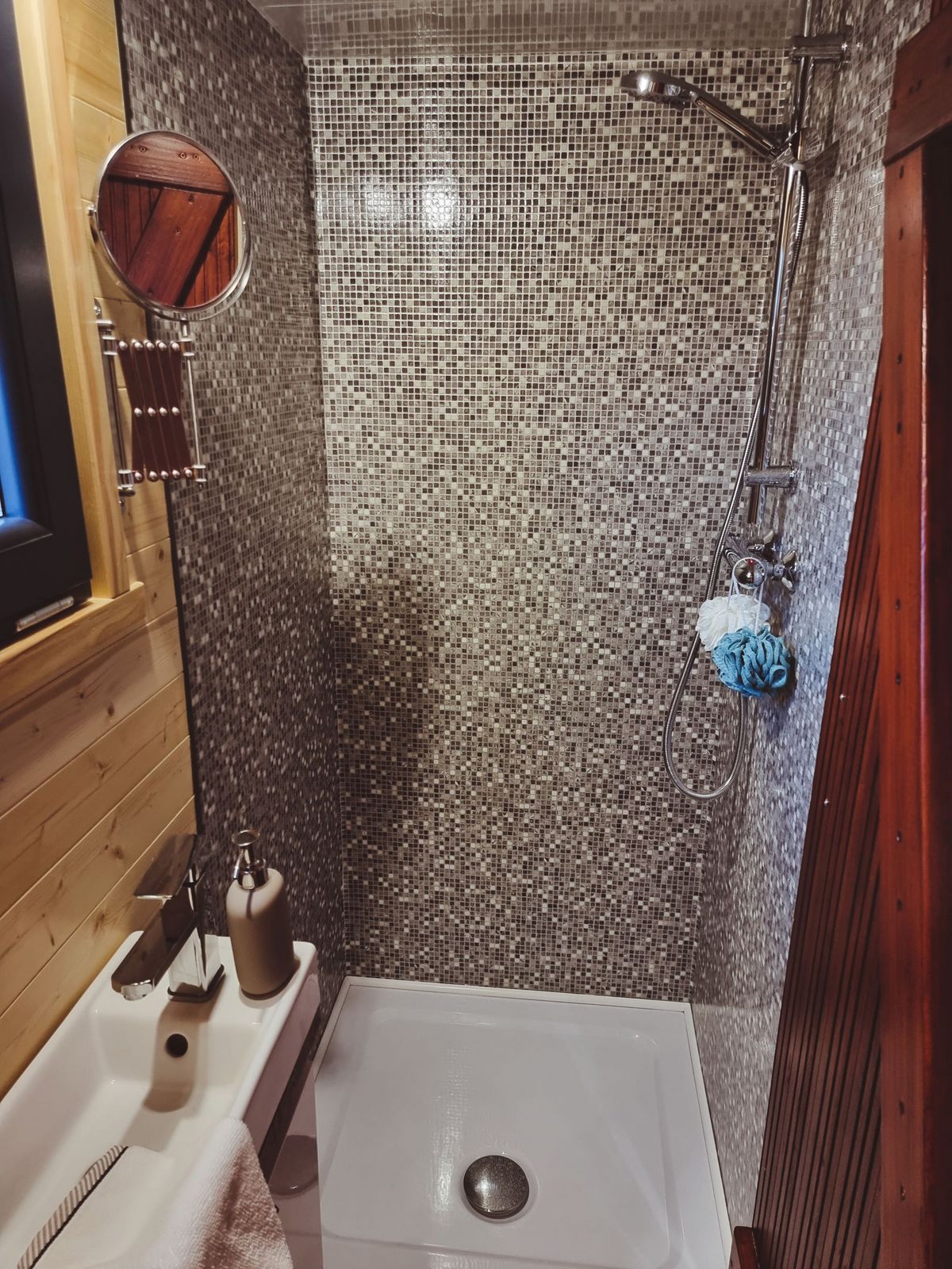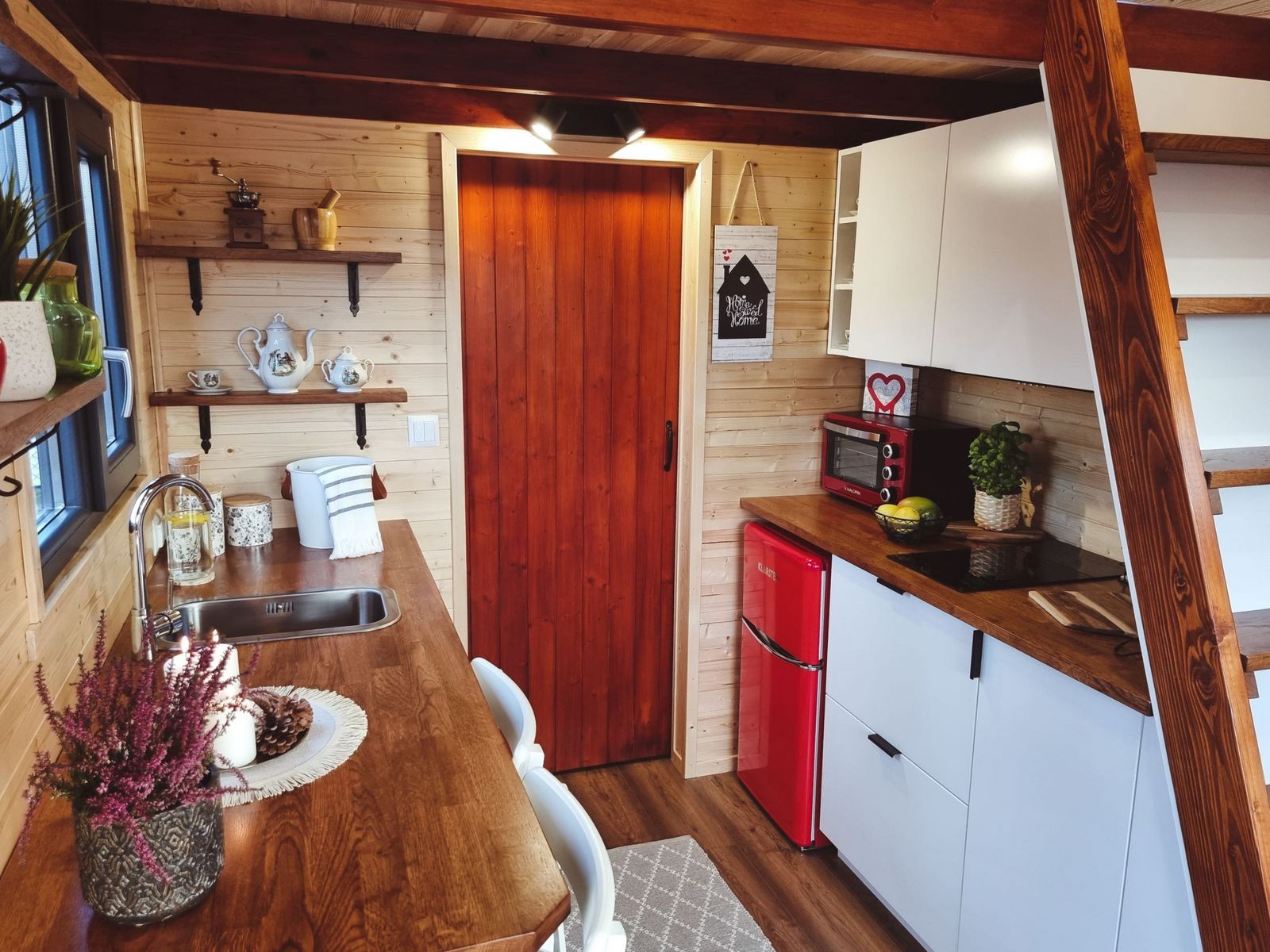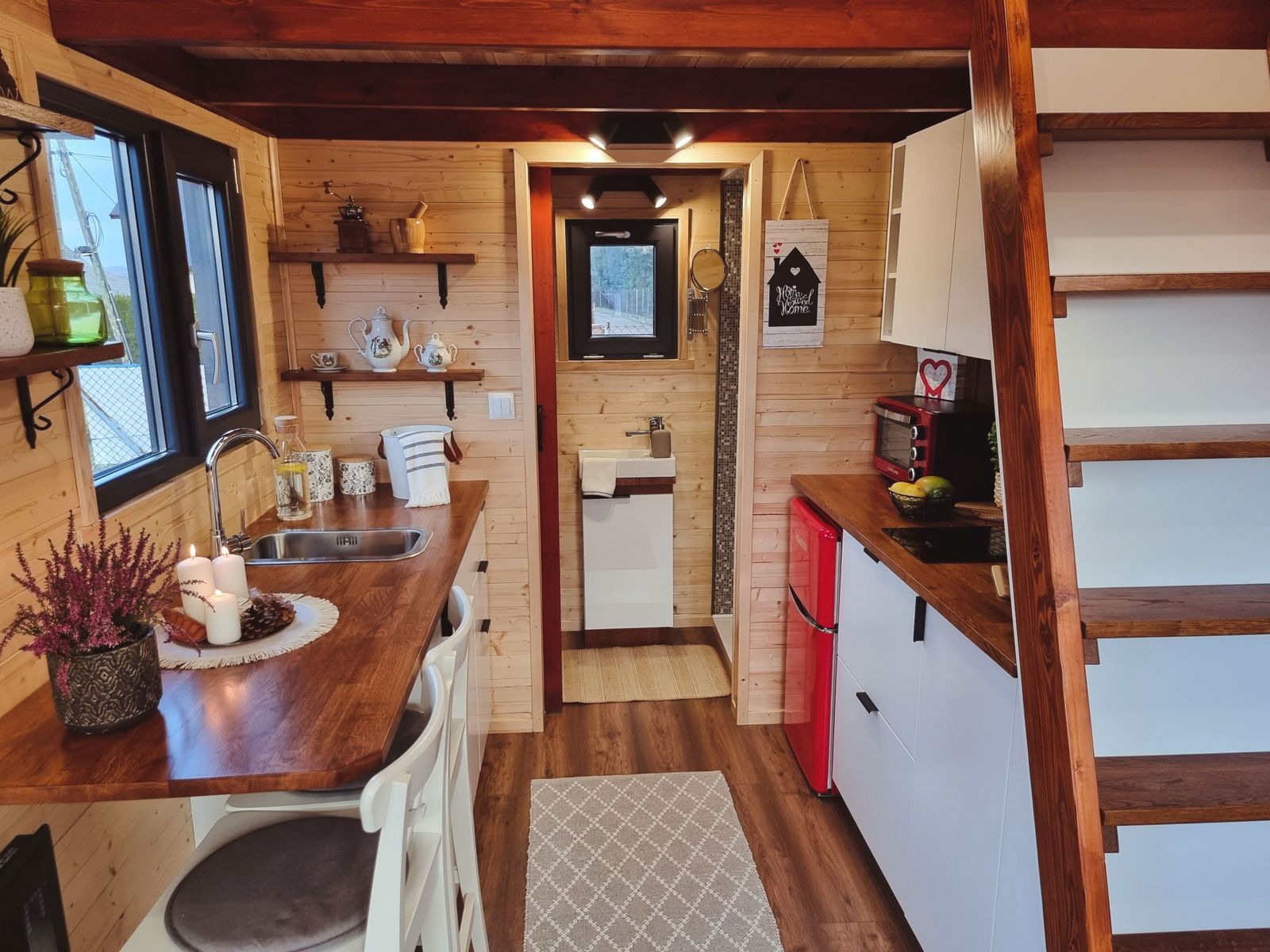 • Konyha: - tömör konyhabútor - Indukciós tűzhely - Mini sütő - hűtő - mosogató - szekrények - asztal • Fürdőszoba zuhanyzóval, mosdóval és vízmelegítővel • Mini társalgó sarokkanapéval, dohányzóasztallal • Mezzanine: matrac, komód • 2-4 hálóhely |